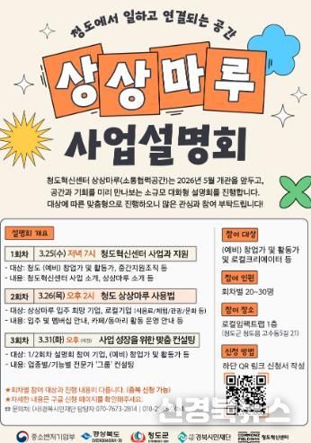 이번 설명회는 총 3회에 걸쳐 진행된다. 1회차는 3월 25일 19시에 (예비)창업가, 지역활동가, 중간지원조직을 대상으로 청도혁신센터의 사업 전반과 상상마루 공간의 비전을 소개한다. 2회차는 3월 26일 14시에 상상마루 입주를 희망하는 기업과 로컬 기업을 대상으로 멤버십, 카페, 동아리 활동 등 운영방식을 안내한다. 3회차는 3월 31일 15시에 앞선 설명회에 참여한 기업 및 지역활동가 중 희망자를 대상으로 업종별·기능별 전문가가 맞춤형 컨설팅을 제공한다.