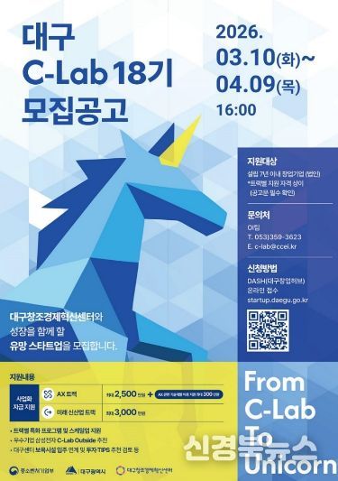 [신경북뉴스] 대구광역시는 인공지능 전환(AX)과 미래 전략 신산업 분야에서 성장 가능성이 높은 스타트업을 발굴하기 위해 ‘대구 C-Lab 액셀러레이팅 18기’ 참가 기업을 4월 9일까지 모집한다.