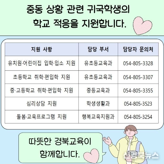 [신경북뉴스] 경북교육청은 최근 중동 지역 정세 불안으로 재외동포와 동반가족의 국내 입국이 이어짐에 따라, 귀국 학생의 원활한 학교 적응을 지원하기 위한 ‘중동 상황 관련 귀국 학생 지원 계획’을 수립․추진한다고 20일 밝혔다.