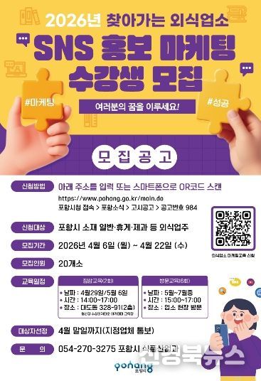 [신경북뉴스] 포항시는 지역 외식업소의 자생력과 온라인 홍보 역량 강화를 위해 ‘2026년 찾아가는 외식업소 SNS 마케팅 교육’ 참여 업소를 모집한다.