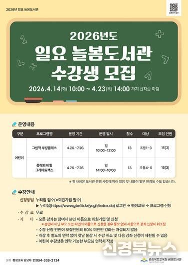 [신경북뉴스] 경상북도교육청 금호도서관은 초등학생들에게 학교의 정규수업 외 추가적인 교육활동의 기회를 부여하기 위하여‘2026년 일요 늘봄도서관’프로그램을 개설하여 수강생을 모집한다.