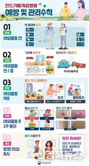 또한 진드기 기피제를 사용하고, 활동 후에는 즉시 샤워와 함께 몸에 진드기가 붙어 있는지 확인해야 한다고 강조했다. 귀가 후에는 옷을 털어 세탁하는 것도 중요하다.