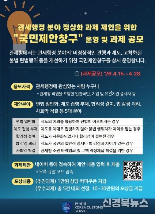 [신경북뉴스] 관세청은 4월 15일 수출입통관, 관세 부과·징수, 관세조사, 마약 단속 등 관세행정 전반의 비정상적인 관행, 고착화된 불법·편법 행위 등을 근절하기 위해 ‘관세행정 정상화 프로젝트’를 추진한다고 밝혔다.