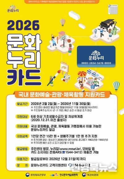 신청 기한은 오는 11월 30일까지로, 주소지와 관계없이 가까운 읍·면 행정복지센터를 방문하거나 문화누리카드 공식 누리집 및 모바일 앱을 통해 발급 신청이 가능하다.