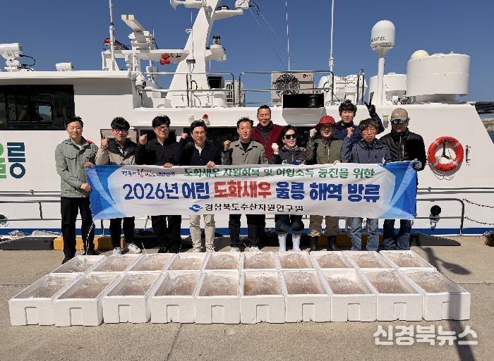 [신경북뉴스] 경상북도 수산자원연구원은 수산자원 회복과 어업인 소득 증대를 위해 동해안의 대표적 고부가가치 품종인 ‘독도새우(품명 도화새우)’ 15만 마리를 4월 16일 울릉 해역에 방류했다고 밝혔다.
