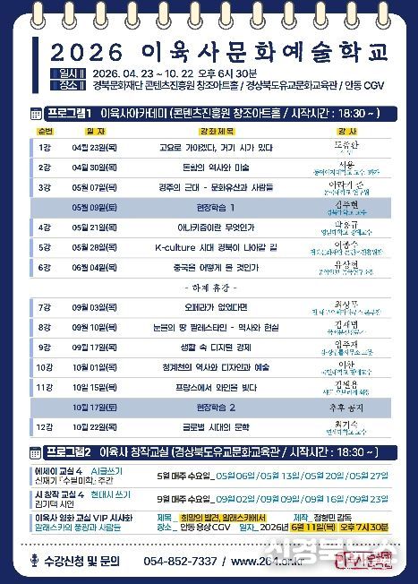 [신경북뉴스] 안동시 이육사문학관은 4월 23일부터 '2026 이육사문화예술학교'를 개강한다. '2026 이육사문화예술학교'는 국내외 저명 강사들이 참여해 인문․예술 전반의 다양한 주제를 다루며, 시민이 일상에서 인문학의 깊이를 체감할 수 있도록 풍성하고 내실 있는 강연으로 운영된다.
