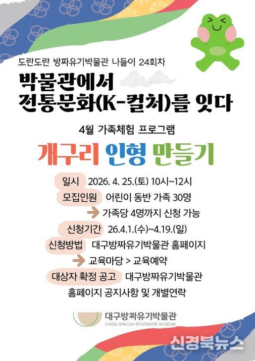 [신경북뉴스] 대구문화예술진흥원 박물관운영본부 소속 대구방짜유기박물관은 화창한 봄날 4월에 전통공예 가족체험과 팔공산 역사문화 이해 특강을 기획하여, 4월 25일 오전 10시에 ‘개구리 인형 만들기’ 체험을, 4월 28일 오후 2시에 ‘고려 태조 왕건 후백제 견훤과 팔공산’ 강의를 개최한다.