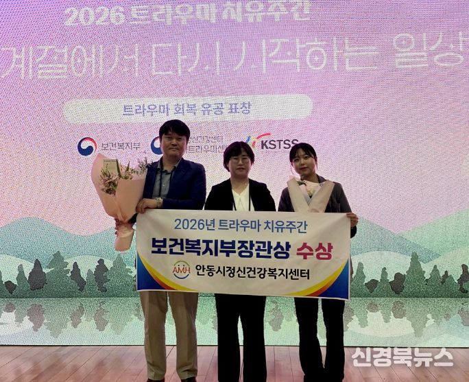 [신경북뉴스] 안동시정신건강복지센터는 20일 국립정신건강센터에서 열린 보건복지부 주최 ‘2026년 트라우마 치유주간’ 시상식에서, 산불 재난 경험자의 심리 회복을 위해 헌신한 공로를 인정받아 보건복지부 장관 표창을 수상했다고 밝혔다.