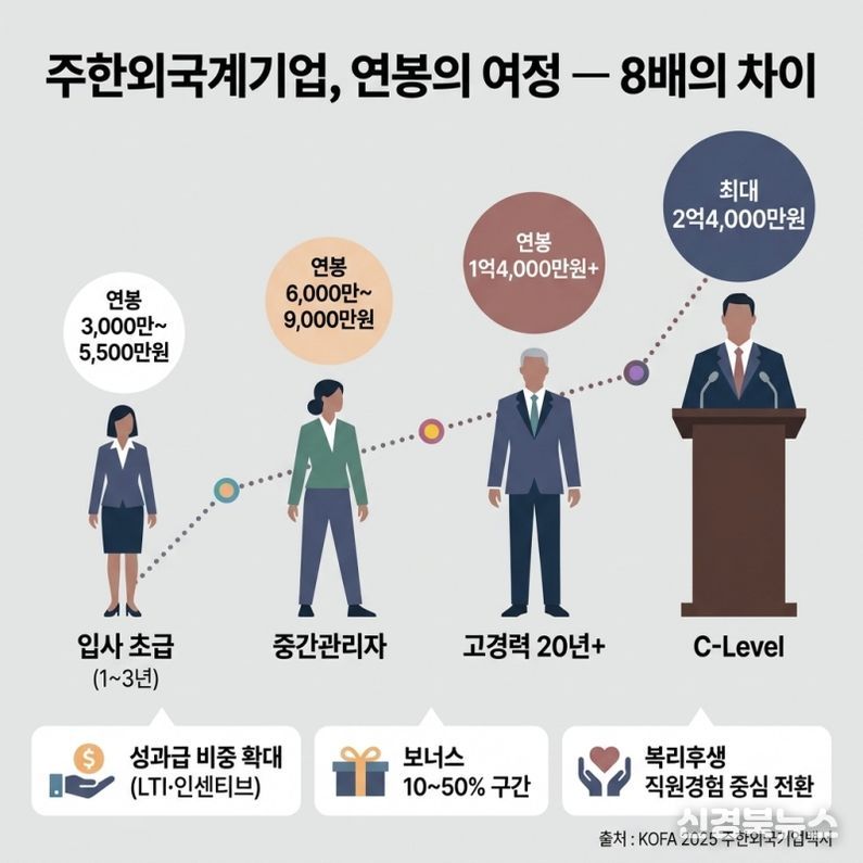 조사 결과에 따르면 외국계기업의 보상 수준은 직무와 연차에 따라 큰 차이를 보였다. 초급(1~3년)의 경우 약 3,000만~5,500만원 수준이었으며, 중간관리자는 약 6,000만~9,000만원, 고경력(20년 이상)은 평균 1억4천만원 이상으로 나타났다. 임원(C-Level)의 경우 평균 약 2억3천만원에서 최대 2억4천만원 수준에 이르는 것으로 분석됐다. 이에 따라 최저 대비 최고 연봉 격차는 약 8배 수준으로 나타났으며, 외국계기업의 보상 구조가 연차와 직무에 따라 뚜렷한 계층 구조를 형성하고 있는 것으로 확인됐다.