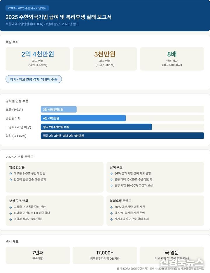 [신경북뉴스] 주한외국기업연합회(상임대표 김종철, KOFA)는 ‘2025 주한외국기업백서’ 혁신판을 발표하고, 작년 6월 실시한 주한외국기업 급여 및 상여금 실태조사와 함께 복리후생 조사 결과를 포함해 공개했다. 이번 백서는 7년째 발간되는 자료로, 기존 조사 대비 한층 고도화된 분석 체계를 적용해 글로벌 전문 조사기관 수준의 HR 리포트로 업그레이드됐다는 평가를 받고 있다.