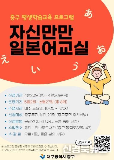 두 과정 모두 중구 주민 성인을 대상으로 과정별 20명을 모집하며, 수강료는 무료다. 신청은 4월 30일까지 대구광역시 중구 통합도서관 누리집(홈페이지) 및 대구 중구 생활문화센터 누리집에 안내된 QR코드를 통해 온라인으로 접수하면 된다.