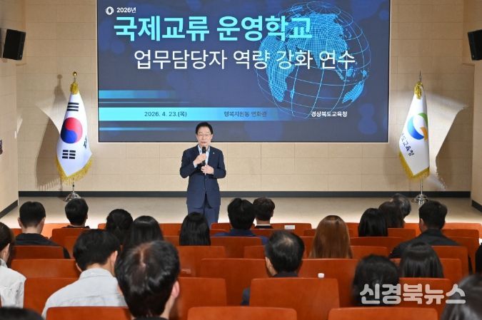 [신경북뉴스] 경북교육청은 23일 본청 행복지원동 연화관에서 도내 국제교류 운영교 업무 담당자와 관리자 등 150여 명이 참석한 가운데 ‘2026년 국제교류 운영학교 업무 담당자 역량 강화 연수’를 개최했다고 밝혔다.