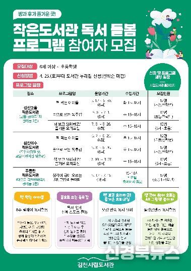 [신경북뉴스] 김천시립도서관(관장 이신기)에서는 지역 내 아이들에게 안전하고 유익한 돌봄 환경을 제공하기 위해 오는 5월부터 8월까지 ‘2026년 함께 키우는 작은도서관 돌봄사업’을 추진한다고 밝혔다.