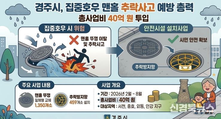 [신경북뉴스] 경주시는 집중호우에 따른 맨홀 추락사고를 예방하기 위해 침수 우려 지역을 중심으로 안전시설 설치사업을 추진한다고 24일 밝혔다.