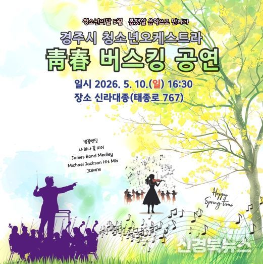 [신경북뉴스] 경주시 청소년오케스트라는 5월 청소년의 달을 맞아 오는 5월 10일 오후 4시 30분 신라대종 앞에서 ‘봄햇살 음악으로 만나다’를 주제로 청소년오케스트라 ‘靑春 버스킹’ 공연을 개최한다.