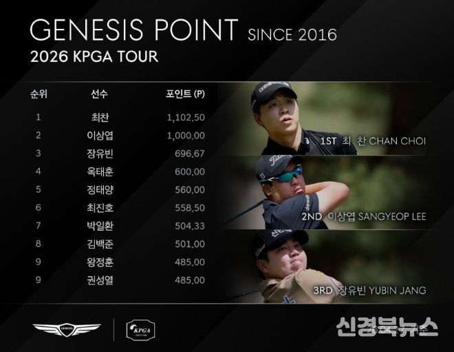 최찬은 ‘2026 우리금융챔피언십’에서 최종합계 13언더파 271타로 우승해 제네시스 포인트 1,000 포인트를 추가한 1,102.50 포인트로 단숨에 제네시스 포인트 1위에 올라섰다. 최찬이 제네시스 포인트 1위에 위치한 것은 2022년 투어 입성 이후 최초다.