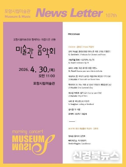 [신경북뉴스] 포항시립미술관은 오는 30일 오전 11시 미술관 로비에서 제107회 미술관 음악회 ‘MUSEUM·MUSIC’을 개최한다.