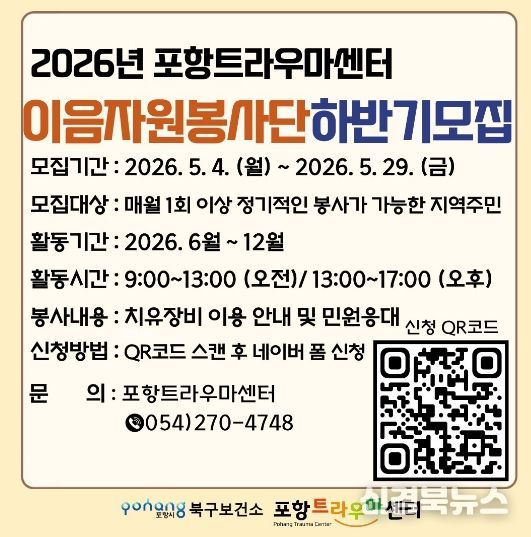 [신경북뉴스] 포항시 북구보건소 트라우마센터는 지역사회 재난 및 일상 속 심리적 어려움을 겪는 시민들의 회복을 지원하기 위해 2026년 하반기 ‘이음 자원봉사단’을 추가 모집한다.