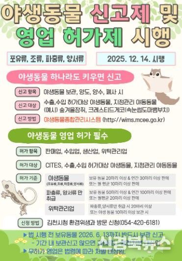 [신경북뉴스] 김천시는 야생동물의 무분별한 포획·거래를 방지하고 건전한 사육 문화를 정착시키기 위해 야생동물 영업 허가제와 보관·거래 신고제를 시행하고 있다고 밝혔다.