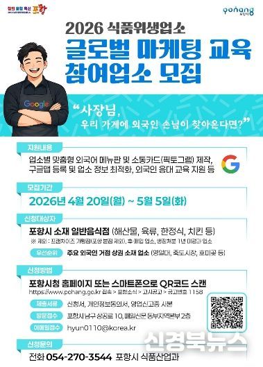 [신경북뉴스] 포항시는 외국인 고객 응대 역량을 강화하기 위해 ‘2026년 식품위생업소 글로벌 마케팅 교육’ 참여 업소 30개소를 모집한다.