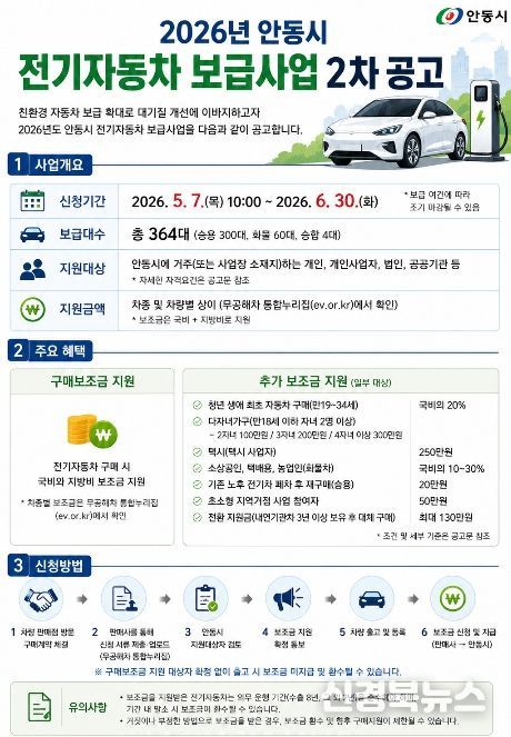[신경북뉴스] 안동시는 최근 지속되는 고유가 현상에 선제적으로 대응하고 시민의 전기자동차 구매 수요를 충족하고자, 당초 7월로 예정됐던 2차 보급 사업을 5월로 앞당겨 추진한다고 4월 30일 밝혔다. 시는 이번 조기 시행을 통해 친환경 무공해 자동차 보급을 가속화하고 시민들의 경제적 부담을 완화할 방침이다.