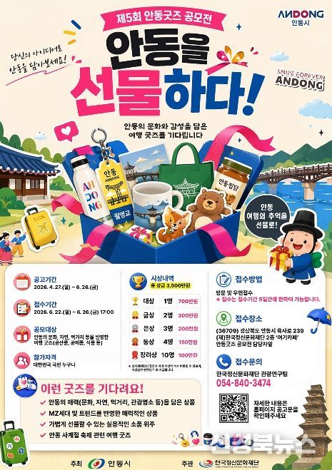 [신경북뉴스] 안동시와 (재)한국정신문화재단은 관광거점도시 안동의 지역 브랜드 가치를 높이고 경쟁력 있는 관광 상품을 발굴하기 위해 『제5회 안동을 선물하다! 안동굿즈 공모전』을 개최한다고 밝혔다.