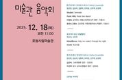 [신경북뉴스] 포항시립미술관은 오는 18일 오전 11시, 제103회 미술관 음악회 ‘MUSEUM · MUSIC’를 개최한다. 이번 음악회는 2025년 마지막 음악회로, 크리스마스와 연말 분위기에 어울리는 다채로운 음악 프로그램을 마련해 시민들에게 따뜻한 문화 향유의 시간을 선사할 예정이다. 미술관 음악회는 2014년부터 ‘문화가 있는 날’과 연계해 정기적으로 운영되고 있는 포항시립미술관의 대표 문화 프로그램이다. 전시 감상과 공연을 결합한 복합 문화 향유 모델로 자리 잡았으며, 매월 다양한 장르의 음악을 선보여 시민들이 일상 속에서 예술을 가까이 접할 수 있도록 하고 지역 문화예술 활성화에도 꾸준히 기여해 왔다. 이번 제103회 음악회는 지역 기반 생활예술단체와 시민 예술인이 함께하는 공연으로 기획됐다. 클래식 기타 앙상블 ‘폴인클래타(Fall in Clatta)’를 중심으로 혼성 포크기타 듀오 ‘로얄젤리’, 하모니카와 팬플룻 협연, 싱어송라이터 공연까지 어우러진 다(多)장르 구성으로 세대와 취향을 아우르는 무대를 선보인다. 공연의 문을 여는 폴인클래타 앙상블은 슈베르트의