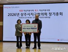 [신경북뉴스] 상주시는 지난 1월 28일 10시 상주교육지원청 대회의실에서 열린 ‘대한적십자사 봉사회 상주시지구협의회 정기총회’에 참석하여 대한적십자사 경북지사에 2026년도 적십자 특별회비를 전달했다. 이번 정기총회는 대한적십자사 경북지사 이미연 사무처장, 대한적십자 봉사회 김미자 상주시지구협의회장, 회원 100여 명 등이 참석했다. 상주시는 매년 적십자 모금에 적극 동참하고 있으며, 이번 특별회비 전달은 대한적십자사가 추진하는 모금 활동의 일환으로 나눔 문화 확산과 시민들의 자발적인 참여를 유도하기 위해 마련됐다. 모금된 적십자 회비는 재해 및 재난 구호, 취약계층 지원 사업, 공공의료 등 인도적 지원 사업의 재원으로 사용될 예정이다. 상주시 관계자는 “어려운 여건 속에서도 이웃을 먼저 생각하고 지역사랑을 실천해 온 적십자 봉사회원들의 헌신에 깊이 감사드린다.”며, 더 많은 이웃이 온정을 느낄 수 있도록 나눔문화 확산에 최선을 다하겠다.”고 말했다.