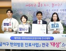 [신경북뉴스] 대구 달서구와 달서구지역사회보장협의체는 제19회 지역사회보장협의체 전국대회에서 열린 우수사례 공모전에서 대상(보건복지부 장관상)을 수상했다. 이번 공모전은 전국 226개 지방자치단체를 대상으로 지역사회보장협의체가 운영 중인 우수사업을 발굴·심사해 시상하는 자리로, 달서구는 ‘달서 한의방문진료사업’의 혁신성과 효과성을 인정받아 최고상인 대상을 수상하는 영예를 안았다. 수상 사업인‘달서 한의방문진료사업’은 ▲ 23개 동 지역사회보장협의체, ▲ 달서구한의사회, ▲ 달서구재가노인복지협회 등 민·관이 협력해 거동이 불편한 어르신이 살던 곳에서 건강하고 안정적인 노후를 보낼 수 있도록 한의 진료와 돌봄 서비스를 함께 제공하는 새로운 의료돌봄 모델이다. 특히 의료와 돌봄을 연계한 지역 밀착형 통합지원 체계를 구축했다는 점에서 높은 평가를 받았다. 달서구는 2014년부터 ‘우리동네 한방주치의 사업’을 통해 어르신에게 맞춤형 한의 진료와 한약을 지원해 왔으며, 이를 2025년 ‘달서 한의방문진료사업’으로 확대해 통합돌봄 체계를 선제적으로 준비하며 초고령사회에 대응하고 있다.