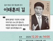[신경북뉴스] 이태훈 대구 달서구청장이 오는 12월 20일 오후 2시, 대구 달서구 웨딩비엔나 컨벤션홀 4층에서 자신의 저서 『이태훈의 길』(부제: 달서 10년, 대구 중심에 서다) 출판을 기념하는 북콘서트를 개최한다. 이번에 출간된 『이태훈의 길』은 단순한 행정 성과집을 넘어, 한 지방 행정가가 걸어온 길을 통해 ‘사람과 도시가 함께 성장해 온 과정’을 담담히 기록한 자서전이다. 책에는 이 구청장의 경북 의성에서의 유년 시절부터 공직에 입문하여 체득한 책임감과 균형 감각, 그리고 다양한 지면을 통해 꾸준히 발표해 온 기고문 속에 담긴 사유들이 하나의 흐름으로 묶여 있다. 특히 달서구청장으로 재임한 지난 10년의 시간을 차분하게 회고하는 대목이 눈길을 끈다. ▲대구시 신청사 유치 ▲아동친화도시 인증 ▲도심 생태축 복원 ▲결혼과 돌봄 중심 정책 등 굵직한 현안들은 단순한 ‘행정의 결과물’이 아닌, 시민들과 함께 이뤄낸 변화의 기록으로 재조명됐다. 성과의 크기보다는 그 과정 속에 담긴 사람들의 이야기에 집중했다는 점이 이 책의 가장 큰 특징이다. 이태훈 구청장은 “저의 한 걸음