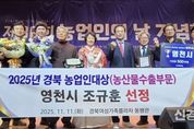 [신경북뉴스] 영천시는 11일 경북여성가족플라자에서 개최된 제30회 농업인의 날 기념행사 ‘농산물 수출부문’에서 조규훈 영천친환경농업영농조합법인 대표가 농업인대상을 수상했다고 밝혔다. 이번 수상은 조 대표가 지역 농산물의 해외 수출 확대에 기여한 공로를 인정받은 결과다. 그는 영천시유기농협회 사무국장으로 재직하며 170여 농가를 조직화해 2006년 화남면에 ‘영천친환경농업영농조합법인’을 설립, 친환경 농산물의 체계적 생산·유통 기반을 마련했다. 또한 저농약 인증 폐지로 판로가 막힌 농가를 위해 내수 중심 구조를 수출 중심으로 전환하고, 전국 수출단지와 유관기관을 직접 방문하며 수출 기반을 구축했다. 그 결과 샤인머스캣, 사과, 복숭아 등 다양한 품목을 동남아 주요국으로 수출하며 2024년 기준 누적 3,600톤, 1,200만 달러의 실적을 달성했다. 조 대표는 “지역 농가와 함께한 노력의 결실로 큰 상을 받게 되어 영광스럽다”며, “앞으로도 영천 농산물이 세계 시장에서 인정받을 수 있도록 최선을 다하겠다”고 말했다. 한편 시는 이번 수상을 계기로 지역 농가들의 수출 역량을 한층 강화하고, 생산·유통