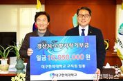 [신경북뉴스] 경산시는 12일 대구한의대학교 변창훈 총장과 교직원들이 십시일반하여 모은 1,005만 원의 고향사랑기부금을 경산시에 전달했다고 밝혔다. 연말을 맞아 고향사랑기부제에 대한 폭발적인 관심이 이어지고 있는 가운데 대구한의대학교의 교직원들은 지난해에 이어 올해도 경산시에 꾸준히 기부를 이어가고 있다. 변창훈 총장은 “지역의 발전을 응원하는 마음으로 교직원들과 함께 고이 모은 고향사랑기부금을 전달하는 뜻깊은 자리에 함께하게 되어 영광이다”고 하며, 앞으로도 지역사회에 계속 힘을 보탤 것을 약속했다. 조현일 시장은 “경산에 대한 한결같은 마음을 고향사랑기부금으로 표현해 주신 데 대하여 깊은 감사를 드린다. 대구한의대학교의 발전도 함께 응원한다”고 답했다. 한편, 경산시는 25일까지 10만 원 이상 기부자를 대상으로 100명을 추첨해 배민앱 이용권(2만원권 50매), 커피쿠폰(1만원권 50매)을 지급하는 이벤트를 실시하고 있다. 자세한 내용은 경산시 고향사랑기부제 홈페이지'gslove.kr'에서 확인할 수 있다.