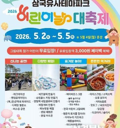 [신경북뉴스] 군위문화관광재단이 다가오는‘2026 어린이날 대축제’를 더욱 알차게 즐길 수 있는 상세 일정과 장소별 프로그램을 전격 공개했다. 이번 축제는 가족들이 가장 방문하기 좋은 5월 2일, 3일, 5일 어린이날 당일에 집중하여 운영된다. 특히 5월 4일(월)은 다음 날인 어린이날 최고의 축제 환경과 안전한 시설을 제공하기 위해 테마파크를 휴장한다. 방문객들은 이 휴식일을 전후로 나뉘어 운영되는 3일간의 스케줄을 확인하여 더욱 여유로운 나들이를 계획할 수 있다. 메인 무대인 가온무대에서는 매일 새로운 무대가 펼쳐진다. 2일과 3일에는 활기찬 군악대 퍼레이드와 레크리에이션이, 축제의 정점인 5일에는 누구나 주인공이 되어 춤출 수 있는 ‘랜덤플레이댄스’와 ‘디제잉 벌룬쇼’가 축제의 대미를 장식할 예정이다. 또한, 축제 기간 내내 한울광장에서는 체험프로그램과 대형 에어바운스가 상시 운영되며, 잔디광장에서는 전통놀이와 함께 피크닉을 즐길 수 있는 휴식 공간이 마련된다. 군위문화관광재단은 “아이들에게 가장 완벽한 어린이날을 선물하기 위해 5월 4일은 철저한 시설 점검과 재정비를 진행할 예정”이라며, “