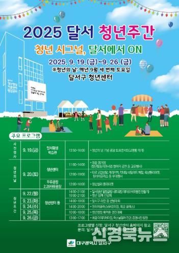 [신경북뉴스] 대구 달서구는 오는 9월 20일 ‘청년의 날’(매년 9월 셋째 토요일)을 기념해 9월 19일부터 26일까지 '2025년 달서 청년주간'을 개최한다고 밝혔다.