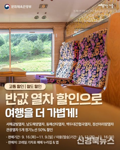 서해금빛열차, 남도해양열차, 동해산타열차, 백두대간협곡열차, 정선아리랑열차 관광열차 5개 정기노선 50% 할인
