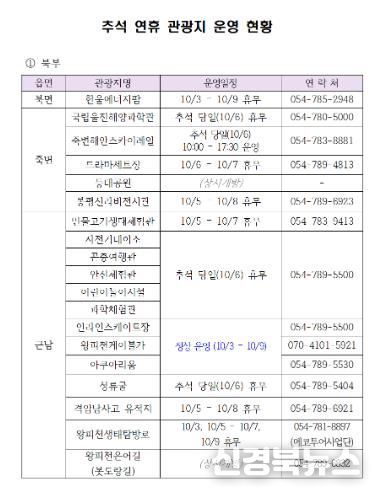 주요 관광지 휴무 및 운영 현황을 살펴보면 ▲국립울진해양과학관과 성류굴, 왕피천공원 내 시설물은 추석 당일인 10월 6일 휴관하며, ▲죽변해안스카이레일, 왕피천케이블카, 아쿠아리움은 연휴 기간 내내 정상 운영된다.