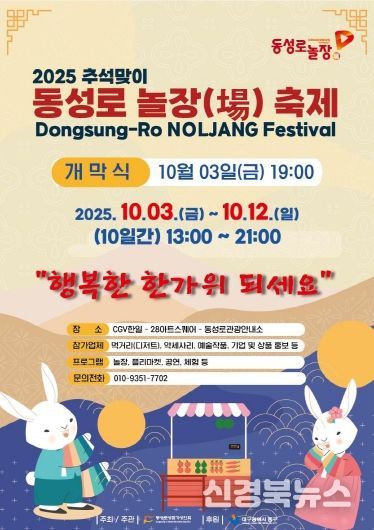 [신경북뉴스] 대구 중구는 10월 3일부터 12일까지 10일간 동성로 보행자전용도로 일원에서 ‘동성로에서 놀며 장보자!’라는 테마로 ‘2025 추석맞이 동성로 놀장(場) 축제’를 개최한다.