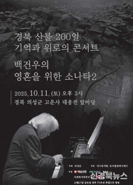 [신경북뉴스] 의성군은 경북 산불 발생 200일을 맞아 세계적인 피아니스트 백건우의 위로 연주회가 오는 10월 11일 토요일 오후 3시, 의성군 천년고찰 고운사에서 열린다고 밝혔다.