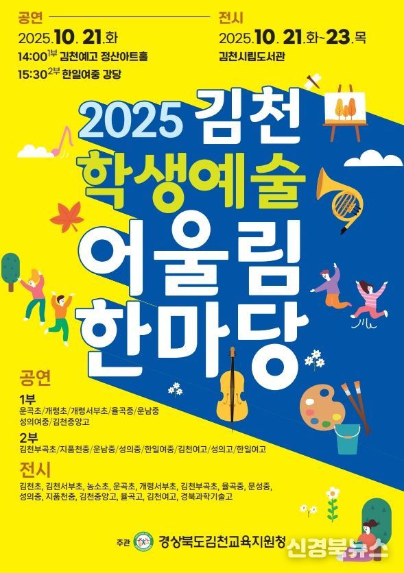 [신경북뉴스] 경상북도김천교육지원청은 오는 10월 21일 김천예술고등학교와 한일여자중학교에서 공연 행사를 열고, 김천시립도서관에서 전시 행사(21일-23일)를 통해 ‘2025 김천학생예술어울림한마당’을 개최한다.