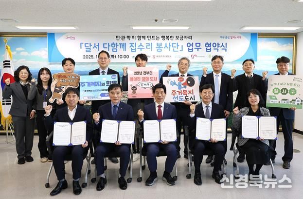 [신경북뉴스] 대구 달서구는 28일 구청에서 5개 기관이 참여한 가운데 ‘달서 다함께 집수리 봉사단’ 업무협약식을 열고, 기술 봉사와 복지 서비스를 결합한 새로운 상생형 주거복지 모델의 출발을 알렸다.