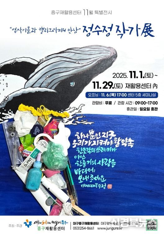 [신경북뉴스] 대구 중구는 11월 1일부터 11월 29일까지 중구재활용센터에서 ‘업사이클과 캘리그라피의 만남’을 주제로 한 정수정 작가 초대전을 개최한다.