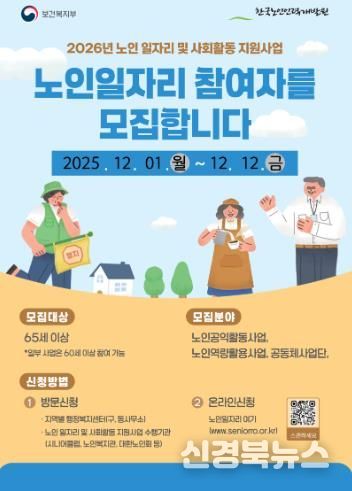 [신경북뉴스] 김천시는 오는 12월 1일부터 12월 12일까지 2주간 노인일자리 및 사회활동 지원사업 참여자를 모집한다고 밝혔다.