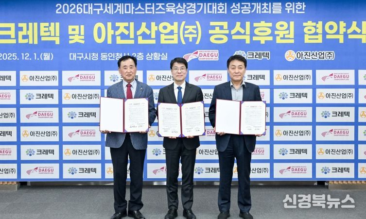 [신경북뉴스] 2026대구세계마스터즈육상경기대회 조직위원회는 12월 1일 오전 10시 30분, 대구광역시청 동인청사에서 지역 우량기업인 크레텍 및 아진산업㈜과 공식 후원 협약을 체결했다.
