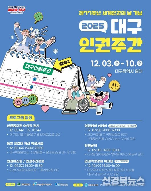 [신경북뉴스] 대구광역시는 세계인권선언(1948년 12월 10일) 77주년을 맞아 12월 3일부터 10일까지 국가인권위원회 대구인권사무소와 함께 대구시 전역에서 ‘2025 대구인권주간’ 행사를 개최한다.
