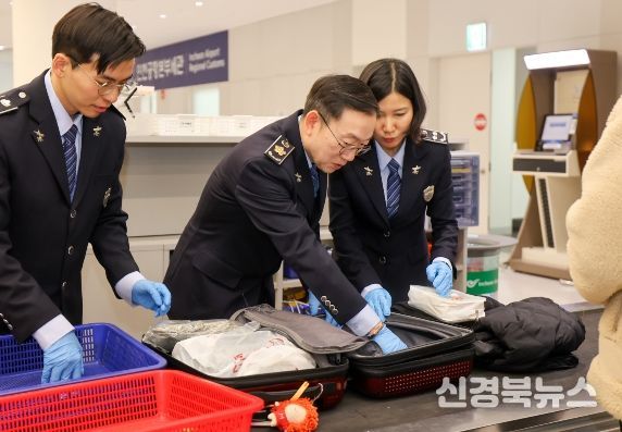 [신경북뉴스] 관세청은 22일 이명구 관세청장이 인천공항을 찾아, 여행자 휴대품 검사관들과 함께 우범 수하물 선별 및 개장검사, 우범여행자 신체 및 밀리미터파 검색기 운용 등 마약 검사업무를 직접 수행하며 여행자 분야 마약 단속 현장을 점검하고, 지난 5일 발표한 ‘관세청 마약 단속 종합 대책’의 철저한 이행을 주문했다고 밝혔다.