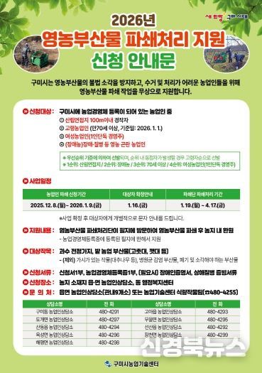 구미시 관계자는 “영농부산물 불법소각은 미세먼지와 산불의 주요 원인 중 하나”라며 “안전한 처리 문화를 현장에 정착시키고, 고령·취약 농업인의 작업 부담을 실질적으로 덜어 농촌 안전과 환경 개선에 기여하겠다”고 말했다.