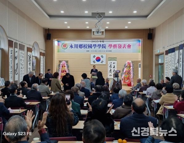 [신경북뉴스] 영천향교 국학학원(원장 이덕기)은 지난 23일 본원 3층 대강당에서 관내 단체장과 수강생 등 200여 명이 참석한 가운데 ‘2025년 정기 학예발표회’를 성황리에 개최했다.