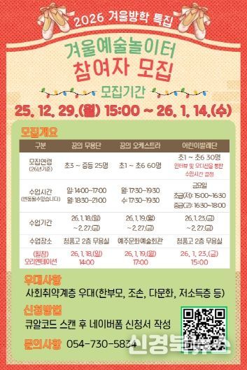 이번 '겨울예술놀이터' 참여자 모집은 2026년 1월 14일까지 진행되며 네이버폼을 통해 신청할 수 있다. 모집 요강과 프로그램에 대한 자세한 사항은 영덕문화관광재단 홈페이지에서 확인 가능하다.