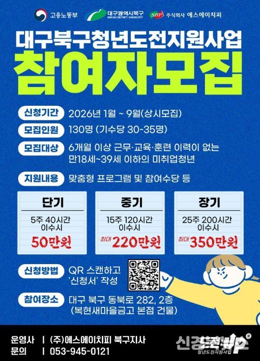 [신경북뉴스] 대구 북구청은 구직 실패와 경제적 부담 등으로 어려움을 겪는 지역 청년들의 사회 진입을 돕기 위해 '2026년 청년도전지원사업' 참여자를 모집한다고 밝혔다.