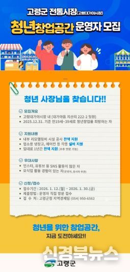 [신경북뉴스] 고령군은 이달 말 30일까지 고령대가야시장 내 청년창업공간에 신규 점포를 운영할 만19~39세 청년 창업가를 모집한다고 밝혔다.